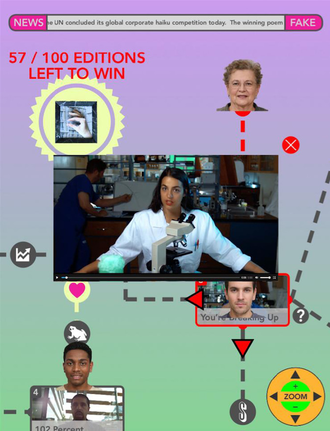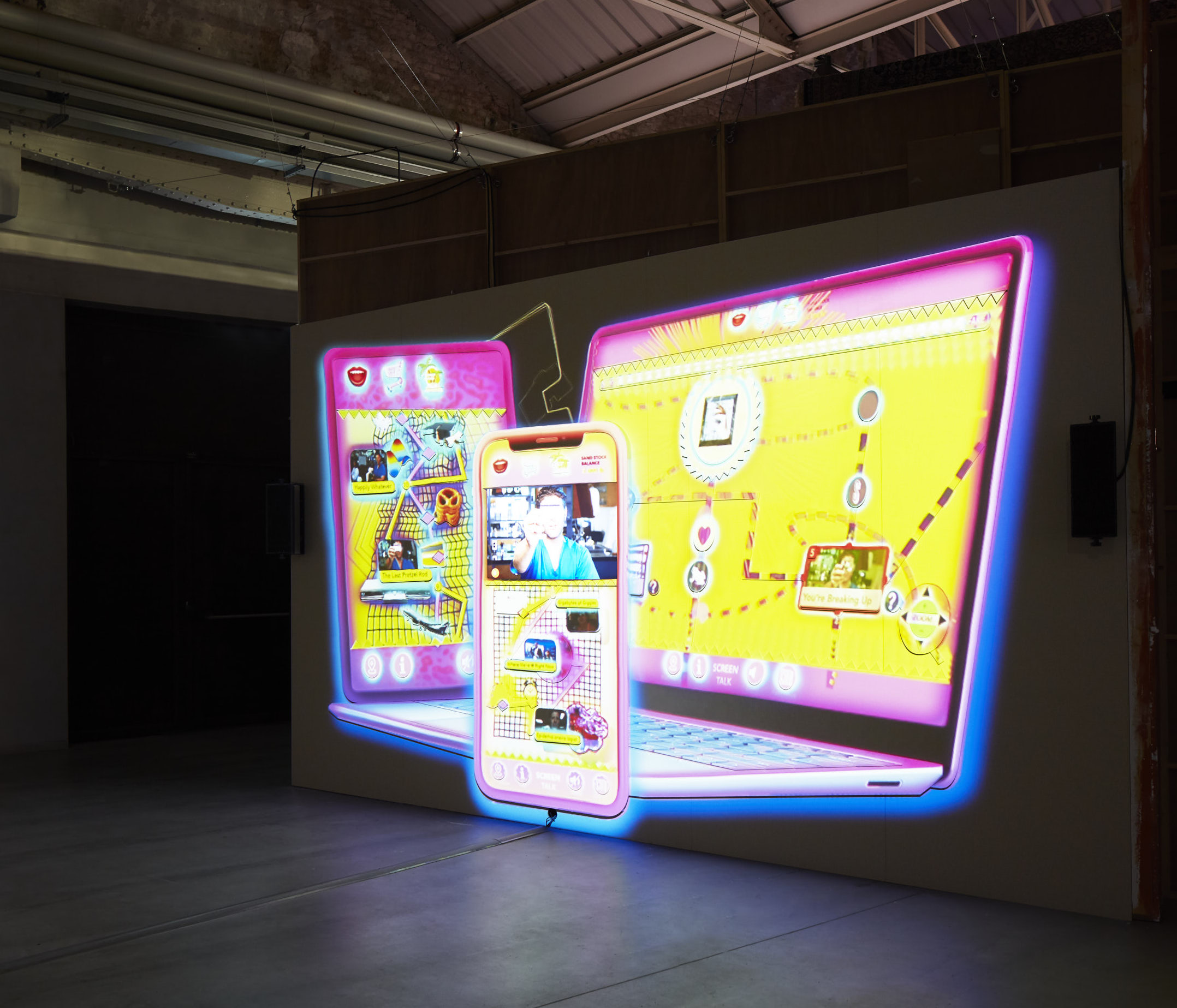 Beloufa is a digital flâneur able to create technologically complex installations where current communication and relational dynamics emerge, he’s interested in web world, social media, video games esthetics and reality TV formats. He uses a typical digital information age vocabulary to shows its own paradoxes, conventions and habits.