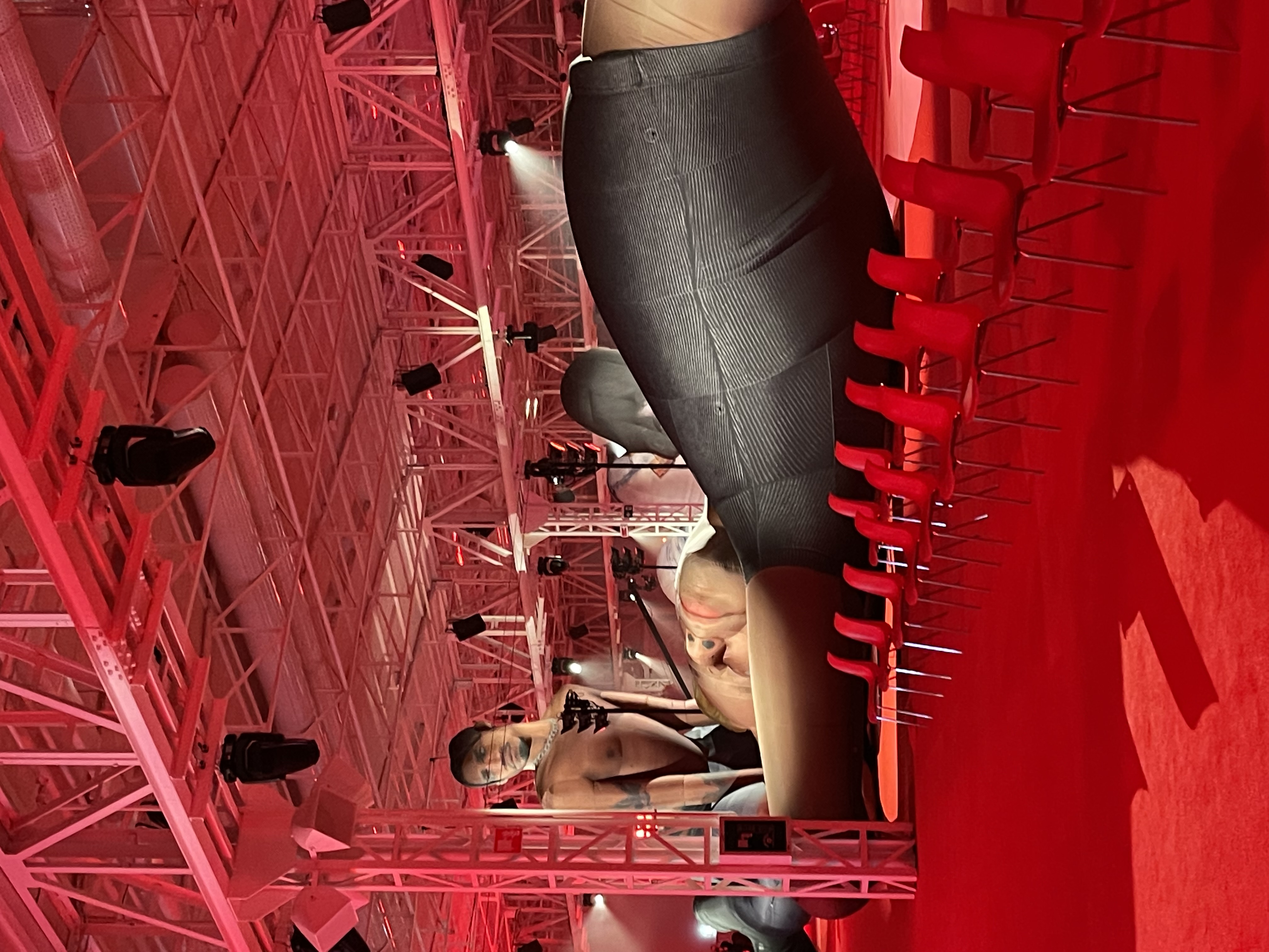 Fire red, sexy red, passion red, this was the color chosen for the setting. Carpeting in these tones covered almost the entire 7,500 square meters of the space, while the lights set everything on fire. Huge inflatables with the faces of real models, in winking poses, up to 7 meters high, dominated the long path of a hypothetical curved catwalk. The show is a real journey into the soul of the brand: it starts with denim in all its forms: sustainable and recycled, deconstructed and reassembled. On the runway we see oversized garments, tattered or reassembled, sensual lurex dresses on models who seem to arrive from another planet and headed towards an imaginary future. And it is a future (with clear references to the fashion of the early 2000s) made of joy, colors and creative madness, the one that closes the show with oversized outerwear in acid colors.